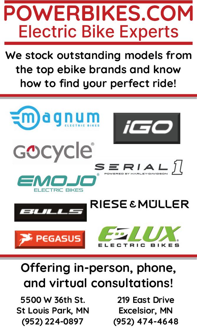 INSIDE Event Listing Info for you Bike Friendly Maps April ....................................... May ........................................ June ........................................ July ......................................... August ................................... September ............................ 2023 listings .......................... 4 8 27 39 54 54 55 What’s an E-Bike ................... What’s E-Bike Range ............. Test Ride an E-bike ............... Keep Your Bike Ready to Ride Biking on the North Shore ..... 12 34 38 51 Back Inside TC Gateway ........................ Shakopee ........................... Lakeville ............................. Richfield ............................. Bloomington ..................... Inver Grove Heights ......... Cottage Grove ................... Hastings ............................. Cannon Valley TrailCannon Falls/Red Wing Winona ............................... Albert Lea ........................... Owatonna .......................... Hutchinson ........................ Willmar ............................... Alexandria .......................... Brainerd ............................. Mesabi Trail ....................... Cook County....................... 6-7 10-11 14-15 Edina .................................. 16-17 20-21 22-23 24-25 28-29 30-31 32-33 36-37 40-41 42-43 44-45 46-47 48-49 52-53 56-57 58-59