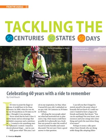 ed on my inspiration. In May, when I turned 60 years old, I embarked on an epic ride: 50 Centuries in 50 States in 50 Days. All along the way people asked me what had motivated me to plan such a trip, what reason could there possibly be to physically tax a body that was poised to enter the world of Social Security benefits and senior discounts? I’m not sure I have a good answer to that question.