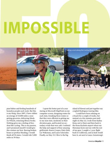pian babies and feeding hundreds of homeless people each week. But this is my thing. Since 2007, I have ridden an average of 10,000 miles a year: getting groceries, delivering Meals on Wheels, returning library books. Nothing gives me a feeling of freedom like cycling. This is my passion, and I promised myself I would give this venture my best. Barring broken bones or profuse bleeding, I would finish all 50 states. I would ride 5,000 miles in 50 days.