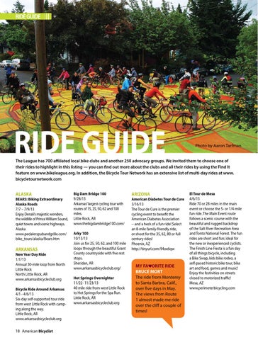 The League has 700 affiliated local bike clubs and another 250 advocacy groups. We invited them to choose one of their rides to highlight in this listing — you can find out more about the clubs and all their rides by using the Find It feature on www.bikeleague.org. In addition, the Bicycle Tour Network has an extensive list of multi-day rides at www. bicycletournetwork.com