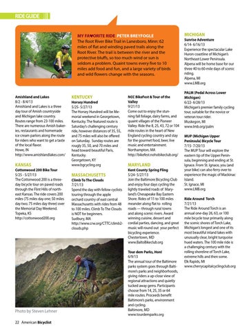 Sunrise Adventure 6/14- 6/16/13 Experience the spectacular Lake Huron coastline of Michigan’s Northeast Lower Peninsula. Alpena will be home base for our three 40 to 60-mile days of scenic riding. Alpena, MI www.LMB.org PALM (Pedal Across Lower Michigan) 6/22- 6/28/13 Michigan’s premier family cycling tour, suitable for the novice or veteran tour rider. Muskegon, MI www.lmb.org/palm MUP (Michigan Upper Peninsula) Bicycle Tour 7/15- 7/20/13 The MUP Tour will explore the eastern tip of the Upper Peninsula, beginning and ending at St. Ignace. From St. Ignace, you (and your bike) can also ferry over to experience the magic of Mackinac Island. St. Ignace, MI www.LMB.org Ride Around Torch 7/21/13 The Ride Around Torch is an annual one-day 26, 63, or 100 mile bicycle tour primarily along the scenic shores of Torch Lake, Michigan’s longest and one of its most beautiful inland lakes with unusually clear, bright turquoise hued waters. The 100 mile ride is a challenging century with the rolling shoreline of Torch Lake, extreme hills and then some. Elk Rapids, MI www.cherrycapitalcyclingclub.org