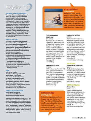 THE LEAGUE OF AMERICAN BICYCLISTS The League of American Bicyclists, founded in 1880 as the League of American Wheelmen, promotes bicycling for fun, fitness and transportation, and works through advocacy and education for a bicycle-friendly America. The League represents the interests of the nation’s 57 million bicyclists. With a current membership of 300,000 affiliated cyclists, including 25,000 individuals and 700 organizations, the League works to bring better bicycling to your community. Contact League officers, directors or staff at League of American Bicyclists, 1612 K Street, NW, Suite 510, Washington, DC 200062850, 202-822-1333; bikeleague@bikeleague.org, fax: 202-822-1334. BOARD OF DIRECTORS Diane Albert, dianealbert@bikeleague.org Harry Brull, Secretary, harrybrull@bikeleague.org Gary Brustin, garybrustin@bikeleague.org Steve Durrant, stevedurrant@bikeleague.org Jennifer Grey Fox, jennifergreyfox@bikeleague.org Alison Hill Graves, allisonhillgraves@bikeleague.org David Madson, davidmadson@bikeleague.org Matt Moore, mmoore@qbp.org Mike Nix, mikenix@bikeleague.org John Siemiatkoski, johnsiemiatkoski@bikeleague.org Gail Spann, gailspann@bikeleague.org Eric Swanson, ericswanson@bikeleague.org, Treasurer Hans van Naerssen, Chair, hansvannaerssen@bikeleague.org Corinne Winter, corinne@bikesiliconvalley.org Tim Young, Vice-chair, timyoung@bikeleague.org Phyllis Harmon, Director Emeritus, phyllis5377@cs.com STAFF Andy Clarke - President Alison Dewey - BFA Program Specialist Darren Flusche - Policy Director Lorna Green - Director of Operations Bill Nesper - Vice President, Programs Elizabeth Kiker - Executive Vice President Katie Omberg - Events and Outreach Manager Alissa Simcox - Education Director Carolyn Szczepanski - Communications Director Scott Williams - Membership Director Nicole Wynands - BFA Program Specialist AMERICAN BICYCLIST MAGAZINE Editor: Carolyn Szczepanski Art Director: Studio D Design Editor Emeritus: Phyllis W. Harmon American Bicyclist magazine (ISSN 0747-0371) is published six times yearly by the League of American Bicyclists, Inc. ©2012 League of American Bicyclists. Reproduction in whole or in part without permission is prohibited. Article queries should be addressed to meghan@bikeleague.org. Your submission of manuscripts, photographs, or artwork, is your warranty that the material in no way infringes on the rights of others and that the material may be published without additional approval. Opinions expressed by writers are their own and do not necessarily reflect the policies of the League.