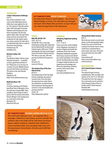 MY FA ORITE RIDE BECKY JOHNSON Iron Mountain Road in South Dakota – also known as Pigtail Bridges to locals. The ride takes you through the heart of the Black Hills and then, to top it off, you can make the big climb to Mt. Rushmore.