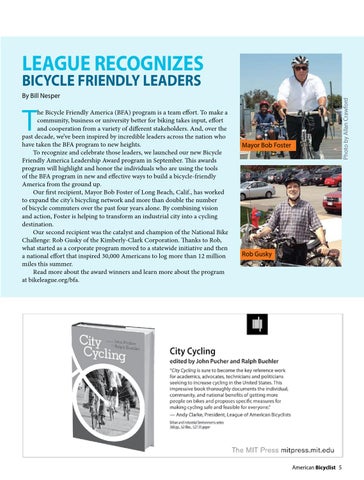he Bicycle Friendly America (BFA) program is a team effort. To make a community, business or university better for biking takes input, effort and cooperation from a variety of different stakeholders. And, over the past decade, we’ve been inspired by incredible leaders across the nation who have taken the BFA program to new heights. To recognize and celebrate those leaders, we launched our new Bicycle Friendly America Leadership Award program in September. This awards program will highlight and honor the individuals who are using the tools of the BFA program in new and effective ways to build a bicycle-friendly America from the ground up. Our first recipient, Mayor Bob Foster of Long Beach, Calif., has worked to expand the city’s bicycling network and more than double the number of bicycle commuters over the past four years alone. By combining vision and action, Foster is helping to transform an industrial city into a cycling destination. Our second recipient was the catalyst and champion of the National Bike Challenge: Rob Gusky of the Kimberly-Clark Corporation. Thanks to Rob, what started as a corporate program moved to a statewide initiative and then a national effort that inspired 30,000 Americans to log more than 12 million miles this summer. Read more about the award winners and learn more about the program at bikeleague.org/bfa.