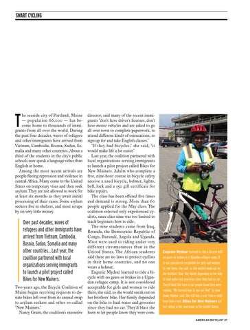Eugenie Mydear learned to ride a bicycle with no gears or brakes in a Ugandan refugee camp. It is not considered acceptable for girls and women to ride there, she said, so she would sneak out on her brothers’ bike. Her family depended on the bike to haul water and groceries since they had no car. They’d blast the horn to let people know they were coming. “We learned how to use our feet” to slow down, Mydear said. She still has a scar from a childhood bike crash. Bikes for New Mainers got her rolling in her new home in the United States. AMERICAN BICYCLIST 37