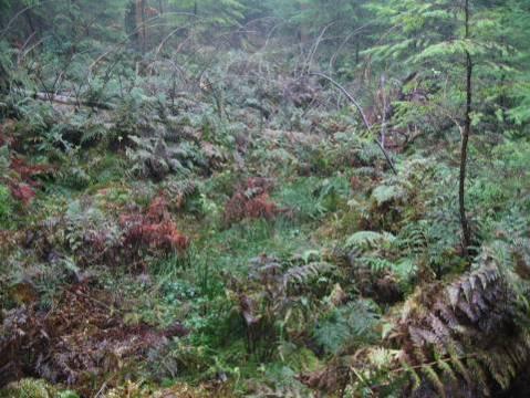 Beskrivelse: Lille våd lavning med mangeløv og lyse-siv i Douglas-bevoksning, omgivet af selvsået Douglas.