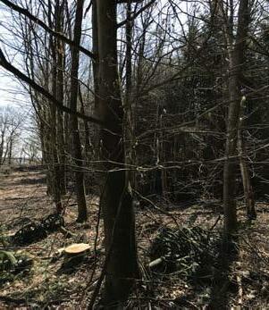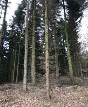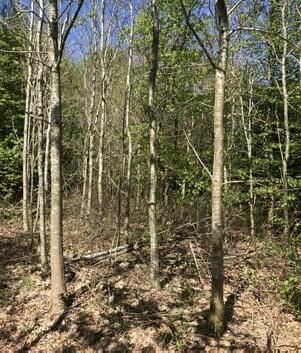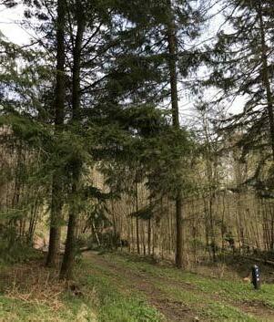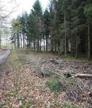 Foto 1 og 2: Stammetætheden i en forstligt drevet skov er høj og træernes alder er ensartet. For at skabe et mere nuanceret udgangspunkt for vildskoven foretages der indledningsvist bl.a. maskinelle indgreb (t.v) og ringning af træer med henblik på at lave stående dødt ved (t.h) (Susanne Frederiksen).