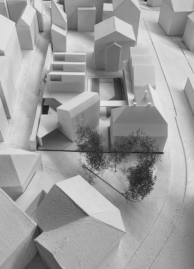 3. Da das Grundstück direkt am See liegt, ist die klassische Form des Innenhofs nicht die ideale Lösung für das Grundstück, da sie die Sicht auf andere Gebäudeteile versperrt. Es muss eine andere Höhe geschaffen werden, um dies zu vermeiden und die Höhe der Gebäude der Nachtbar zu respektieren.