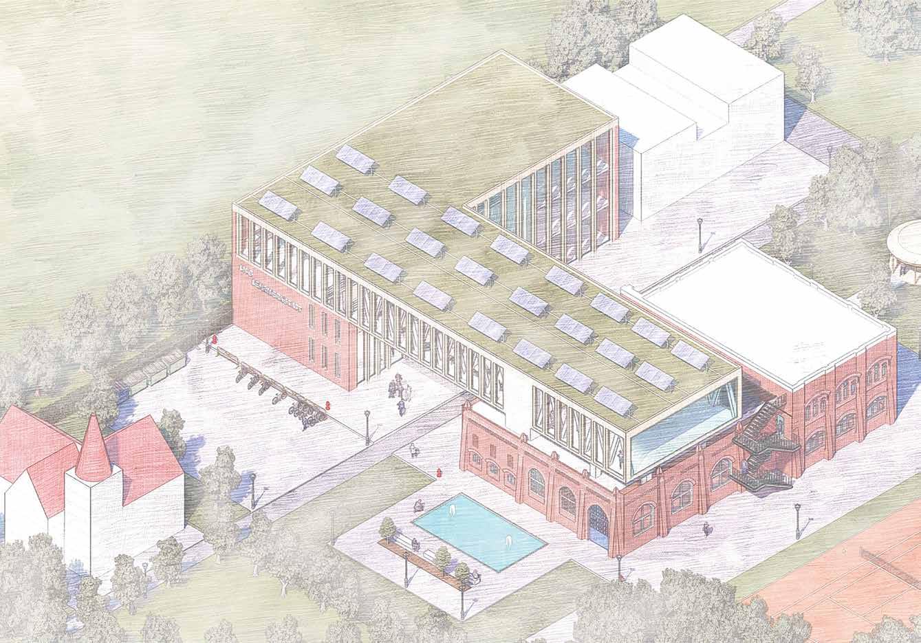 Das Gebäude hat einen industriellen Charakter, der technische Teil, wie z. B. die Belüftung, sollte offen und nicht versteckt sein. Das andere Gebäude hat eine schiefergedeckte Wand, um das Sonnenlicht und den Blick auf das Schloss von innen nicht zu blockieren.