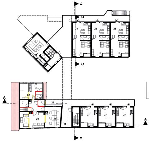Wie im Konzeptentwurf beschrieben, ist das neue Gebäude in drei Teile gegliedert. Gebäude A, das zur historischen Stadtmauer hin ausgerichtet ist, ist hauptsächlich für Apartments konzipiert, während Gebäude B, das zur Hospitalstraße hin ausgerichtet ist, speziell für Studenten entworfen wurde und Göttingens Status als Studentenstadt widerspiegelt. Gebäude B ist schmaler als Gebäude A, was zu kleineren Räumen und weniger Wohnfläche führt.