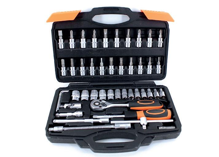 Stort pipesett med 219 deler. 3 stk skraller, 12 stk fastnøkler og det man trenger av bits og piper.