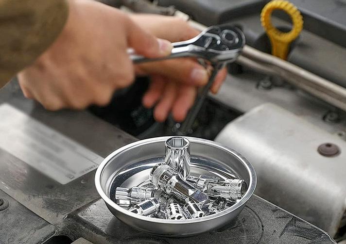 Magnetskål med gummibelagt magnetfot. For sikker oppbevaring av skruer, muttere, skiver m.m. Kan festes på f.eks. bilen, et skap eller en ståloverflate.