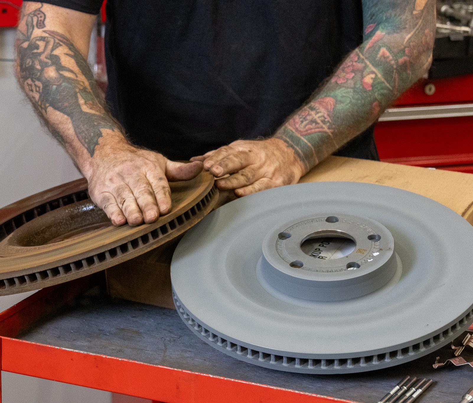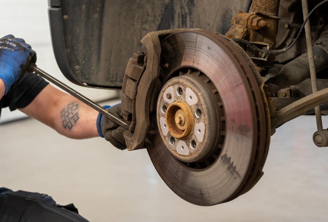 Selve prosessen er i prinsippet lik på de fleste biler: hjulet av, kaliper løsnes, klosser og skiver byttes før alt monteres tilbake. Bak kan det være litt mer å ta hensyn til, særlig på biler med elektrisk parkeringsbrems, men dette kan ofte settes i servicemodus via bilens system. – Under karosseriet finner du fortsatt mekanikk som lar seg skru på, sier Borgemoen.