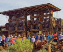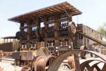 The large wooden struc ture on the hill overlooking the museum building is a Cossak 20stamp ore mill, and was state - of-the -ar t mining equipment 100 years ago. A stamp mill is a large mechanical device, essentially a monster mor tar and pestle. It is amazing ours has sur vived after being moved from Bland, New Mexico to Apache Junc tion; then restored; and now runs for regular