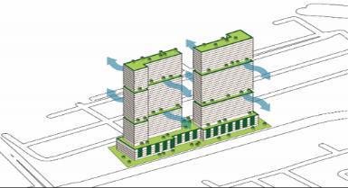 A vertical floor arrangement is implemented using a mezzanine-style concept to optimize ventilation through the stack effect.