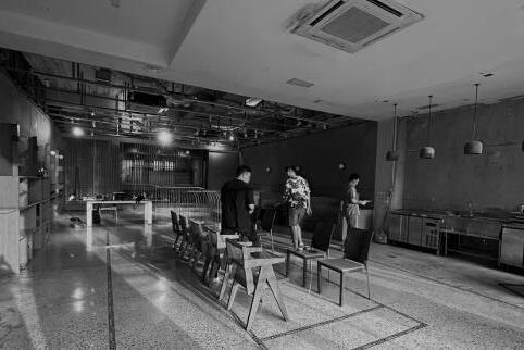 The black and white photo capture the existing restaurant space prior to renovation. The interior features a perforated metal ceiling with an arched section on one side, adorned with a delicate trim that lends a touch of femininity to the ambiance.
