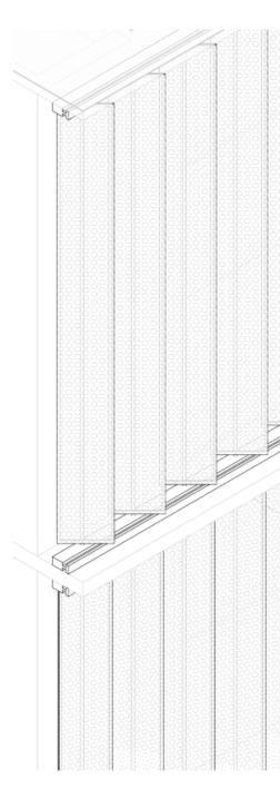 Aluminum perforated metal is used as sun shading to reduce solar heat from the east and west sides.