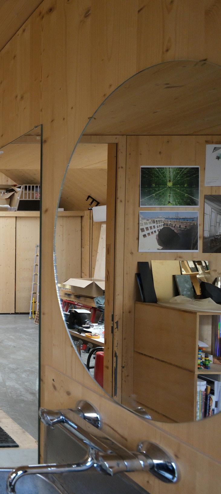 arbejdede jeg i mange år i Olafur Eliassons studio. Den arbejdskultur – den åbne udveksling, prototypetænkningen, selvfølgeligheden i at bruge materialet som erkendelsesmedium – har præget mig. Jeg lærte, at et studio ikke så meget er et ’inspirationssted’ men nærmere et sted, hvor man skaber de rigtige betingelser: for koncentration, for forsøg og fejl – og for de samtaler der opstår mellem tingene selv og kunstneren (eller mig).