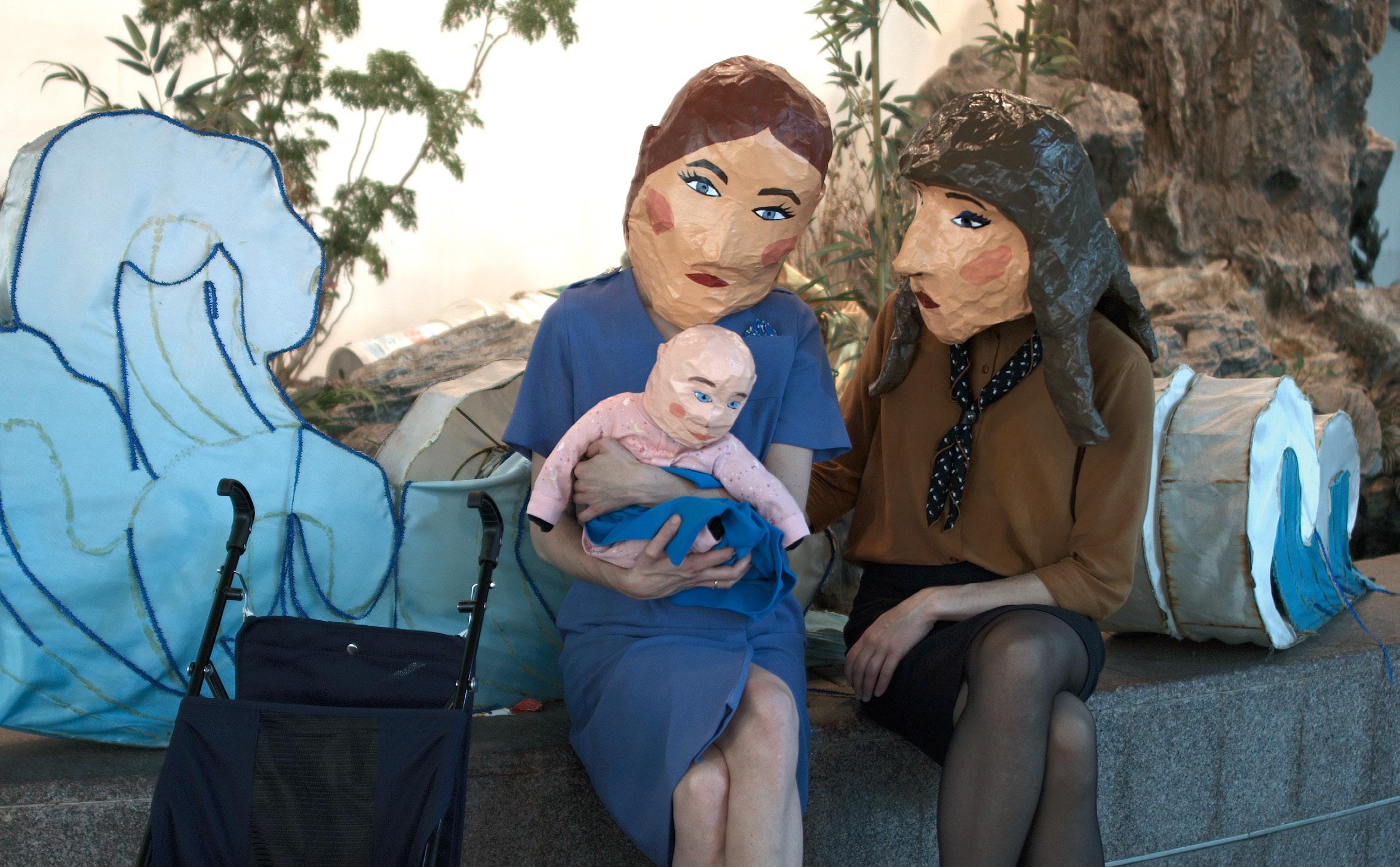 MB: “Og mens vi boede der, hængte vi eksempelvis vores vasketøj til tørre over gelænderet på altanen på den her ikoniske professorbolig. Det gav os ideen til også at hænge miniature-tøj på gelænderet i modellen og filme den scene. Så lige i dette tilfælde har vi indarbejdet nogle ret konkrete elementer fra vores hverdag og erfaringer som kvindelige kunstnere med børn.”