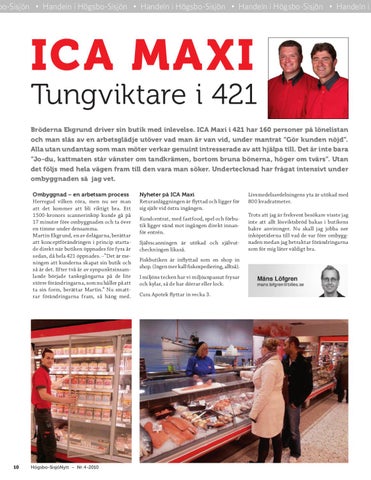 Tungviktare i 421 Bröderna ekgrund driver sin butik med inlevelse. ICA Maxi i 421 har 160 personer på lönelistan och man slås av en arbetsglädje utöver vad man är van vid, under mantrat ”gör kunden nöjd”. Alla utan undantag som man möter verkar genuint intresserade av att hjälpa till. Det är inte bara ”jo-du, kattmaten står vänster om tandkrämen, bortom bruna bönerna, höger om tvärs”. utan det följs med hela vägen fram till den vara man söker. undertecknad har frågat intensivt under ombyggnaden så jag vet. Ombyggnad – en arbetsam process Herregud vilken röra, men nu ser man att det kommer att bli riktigt bra. Ett 1500-kronors scannerinköp kunde gå på 17 minuter före ombyggnaden och ta över en timme under densamma. Martin Ekgrund, en av delägarna, berättar att konceptförändringen i princip startade direkt när butiken öppnades för fyra år sedan, då hela 421 öppnades. –”Det är meningen att kunderna skapat sin butik och så är det. Efter två år av synpunktsinsamlande började tankegångarna på de lite större förändringarna, som nu håller på att ta sin form, berättar Martin.” Nu smattrar förändringarna fram, så häng med.