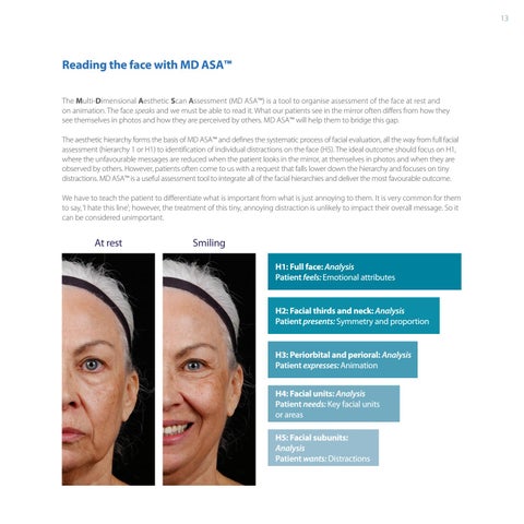 Reading the face with MD ASA™ The Multi-Dimensional Aesthetic Scan Assessment (MD ASA™) is a tool to organise assessment of the face at rest and on animation. The face speaks and we must be able to read it. What our patients see in the mirror often differs from how they see themselves in photos and how they are perceived by others. MD ASA™ will help them to bridge this gap. The aesthetic hierarchy forms the basis of MD ASA™ and defines the systematic process of facial evaluation, all the way from full facial assessment (hierarchy 1 or H1) to identification of individual distractions on the face (H5). The ideal outcome should focus on H1, where the unfavourable messages are reduced when the patient looks in the mirror, at themselves in photos and when they are observed by others. However, patients often come to us with a request that falls lower down the hierarchy and focuses on tiny distractions. MD ASA™ is a useful assessment tool to integrate all of the facial hierarchies and deliver the most favourable outcome. We have to teach the patient to differentiate what is important from what is just annoying to them. It is very common for them to say, ‘I hate this line’; however, the treatment of this tiny, annoying distraction is unlikely to impact their overall message. So it can be considered unimportant.