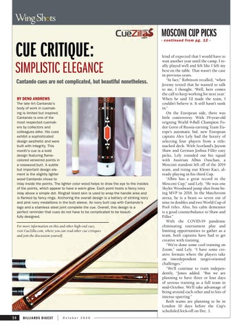 CUE CRITIQUE: SIMPLISTIC ELEGANCE Cantando cues are not complicated, but beautiful nonetheless. BY DENO ANDREWS The late Art Cantando’s body of work in cuemaking is limited but inspired. Cantando is one of the most respected cuemakers by collectors and colleagues alike. His cues exhibit a sophisticated design aesthetic and were built with integrity. This month’s cue is a bold design featuring flamecolored veneered points in a rosewood butt. A subtle but important design element is the slightly lighter wood Cantando chose to inlay inside the points. The lighter color wood helps to draw the eye to the insides of the points, which appear to have a warm glow. Each point hosts a fancy ivory inlay above a simple dot. Ringtail lizard skin is used to wrap the handle area and is flanked by fancy rings. Anchoring the overall design is a battery of striking ivory and pink ivory medallions in the butt sleeve. An ivory butt cap with Cantando’s logo and a stainless steel joint complete the cue. Overall, this design is a perfect reminder that cues do not have to be complicated to be beautifully designed. For more information on this and other high-end cues, visit CueZilla.com, where you can read other cue critiques and join the discussion yourself.