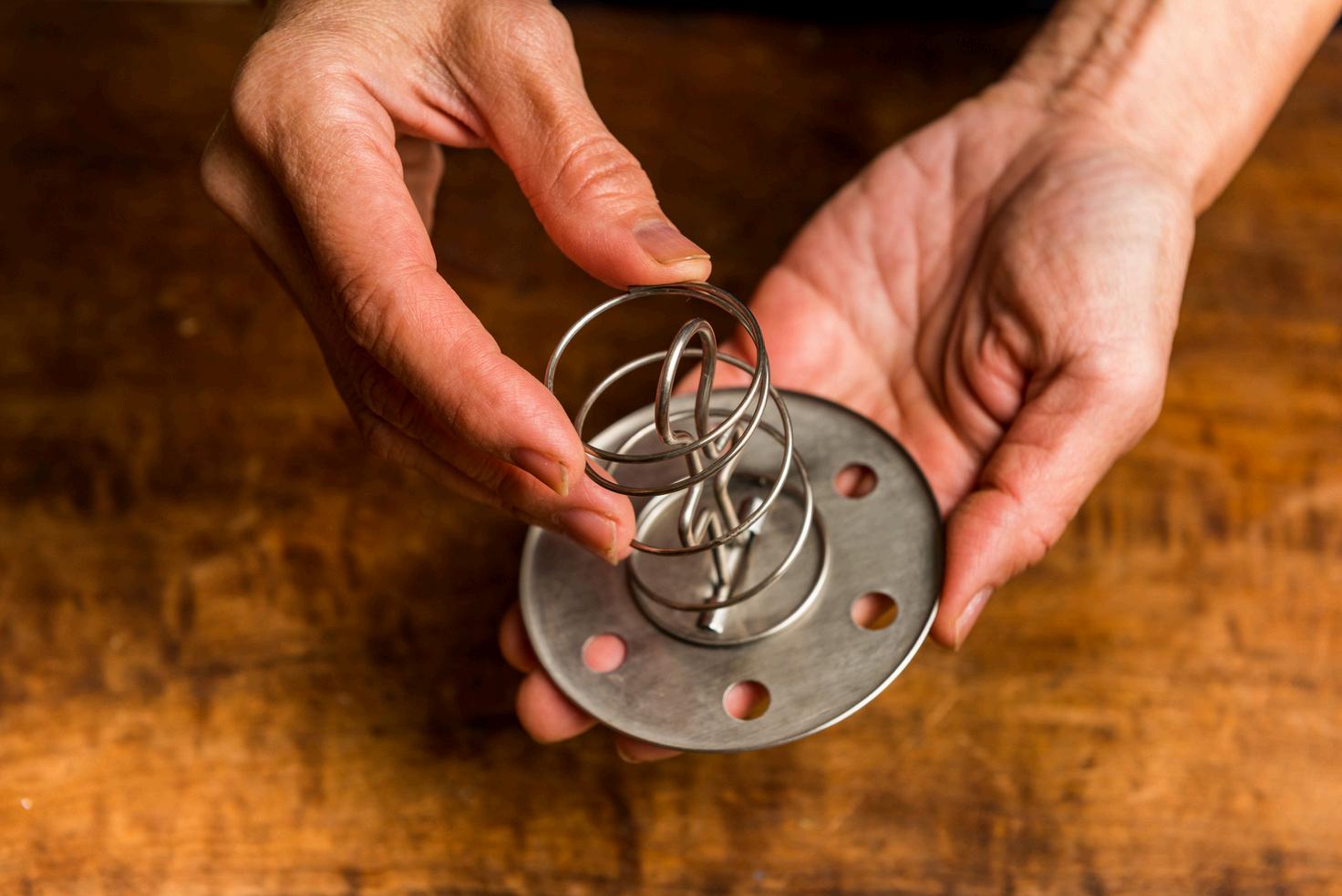 Stainless steel spring and press system keeps ingredients submerged below the brine level