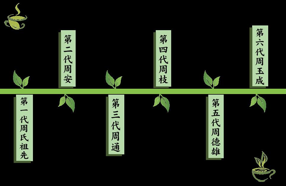 周家祖先早期在福建安溪務農,而後遷 徙至三峽,帶著茶苗尋找適合種植的林地開 墾種植、採收、製作、販售以維持生計。周老 闆回憶道:「家中有八個兄弟姊妹,從小就在 茶園和柑橘園中長大,必須分擔茶園和果園的 工作。上學前的第一件事就是去茶園採茶,再 加上是家中長子,每一道製茶的程序都必須要 學會。從搬運、炒菁、揉捻到解塊,白天上學 晚上製茶,常常凌晨一、兩點都還沒睡,這樣 的辛勤的日常一直從小學持續到國中。」隨著 大眾對茶葉的需求量上升,工作量也開始逐漸 增加,每天的生活被製茶佔據大半,導致他有 一段時間非常抗拒製茶。後來由於父母忙不過 來,也不捨得他們那麼辛苦,以孝心為契機, 重拾家中的製茶工作。