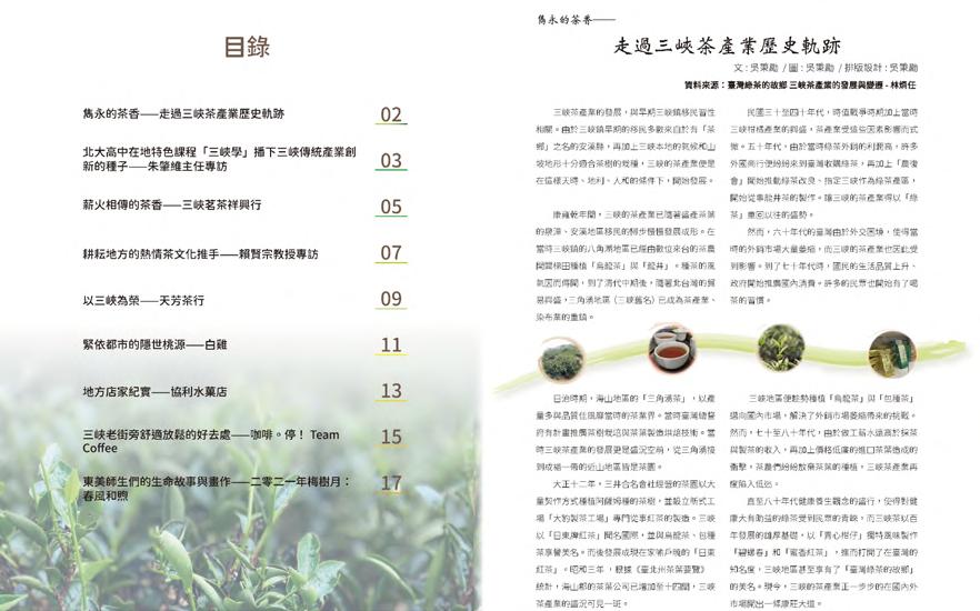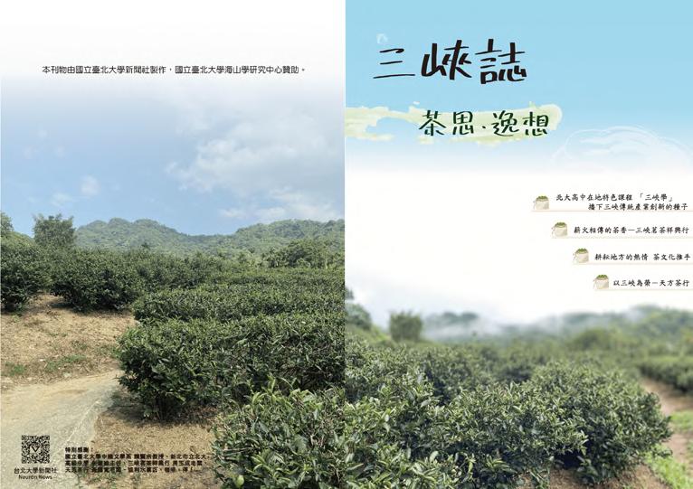 新聞社地方文史刊物《三峽誌:茶思逸想》 帶領北大新聞社與本校長期「深耕在地文化」且「注重大學社會責任(USR)」的海山學研究中心合作,配合 一年一度結合產、官、學資源的「三峽綠茶季」活動,製作地方文史刊物《三峽誌:茶思逸想》。 在本雜誌中擔任報導副編輯並設計主視,負責與海山學研究中心主任與活動負責人進行雜誌的協作與溝通, 並且進行數篇報導的訪問、撰寫、攝影、編輯,以及整體雜誌主視覺、封面、封底設計、製作,並且協助社員 進行圖文編輯與排版。 以茶園實景與手繪虛景融合,寓意三峽茶的未來願景 善用故事與報導,帶「三峽的人」來場深度的精神旅遊 本雜誌以「三峽知名的茶產業」為創作主軸,收錄有關地方文史軌跡與地方創生紀實的內容。從取材、專題 人物訪談到紙本刊物的編輯、設計與印製,總計產出8篇報導與專題採訪,發行約1000本。 透過報導詳述「三峽茶產業文化與歷史發展軌跡的介紹」、「在地茶產業經營者的經營理念、經營故事與產 業第一線的甘苦談」、「倡導並積極推動在地深度文化學習的老師們的精神理念」、「在地店家對於三峽的熱 愛與堅持」以及「在地旅遊景點的文化與歷史意義」等議題。 帶領新舊市鎮的在地居民、台北大學的師生人員們來一趟深度的「三峽之旅」,幫助「在三峽的人」認識並 了解在地的歷史足跡和獨特文化,期望為三峽的產業帶來正向的改變與影響。 天芳茶行老闆黃耀寬講述三峽茶產業困境 三峽白雞「行修宮」為三峽旅遊特色景點 以「茶」為視覺主體,讓茶香奔放於茶產業發展史 20