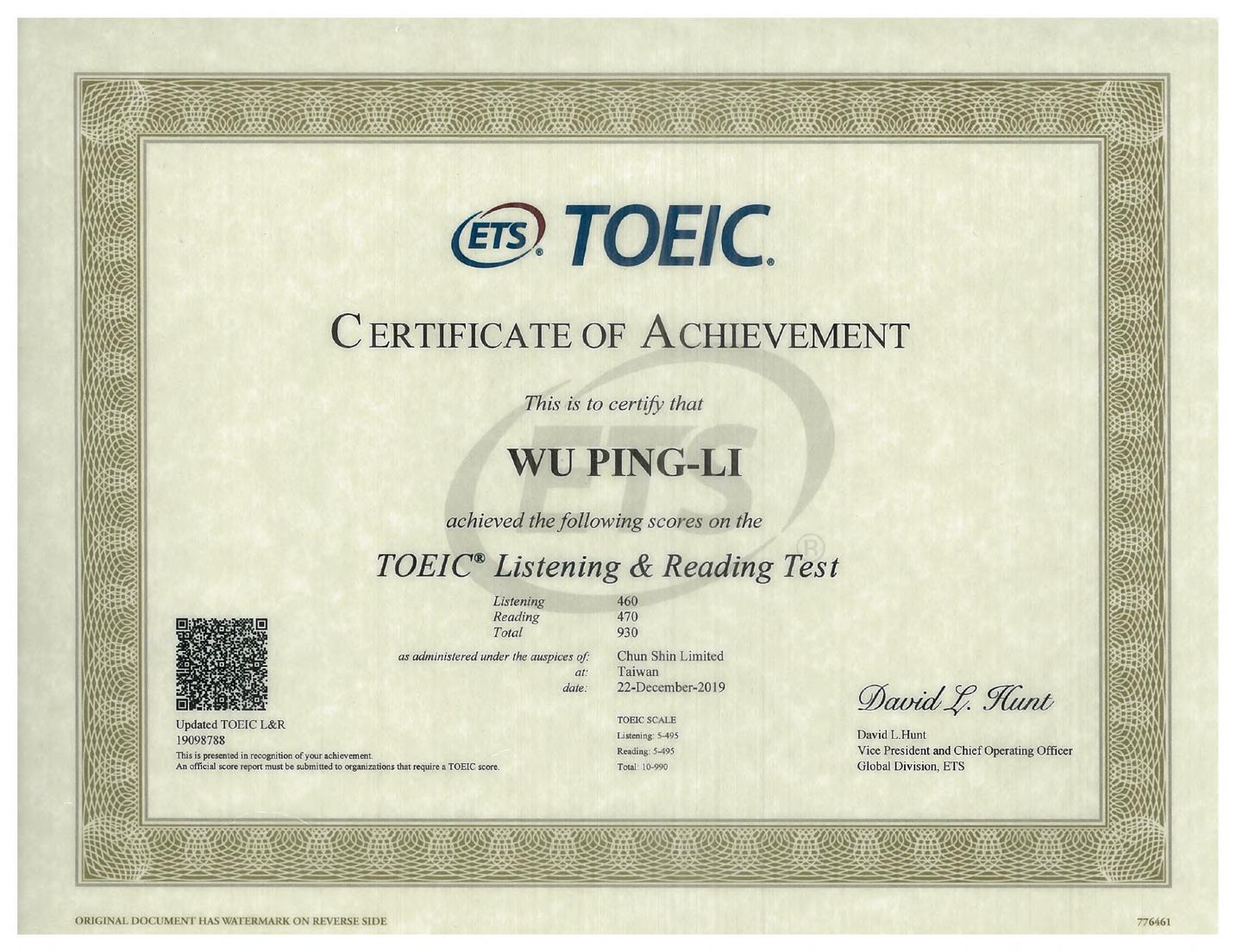 證照 TOEIC® Listening and Reading Test 金色證書 930分 台灣行銷研究學會 行銷知識檢定合格證照 臺灣行銷 研究學會 行銷知識檢定合格證書 Certificate of Marketing Knowledge 吳秉勵 參加行銷知識檢定線上考試成績合格,特此頒發證書。 has passed the online examination of marketing knowledge. 證書字號 Certificate ID: TwMKT-EKLP-XVQ5 發證日期 Issue Date: February 03, 2021 考試形式: 100題選擇題, 4選 1。 70分為合格。 90分為精熟。考試時間 50分鐘。採指定時間線上自主考試,未設置集中考場。 Examination Details: Online exam; 100 multiple choice questions; choose one of the four; pass score: 70; Exam time: 50 minutes. 證書等級 Level: :合格 Pass apple56700@gmail.com 23
