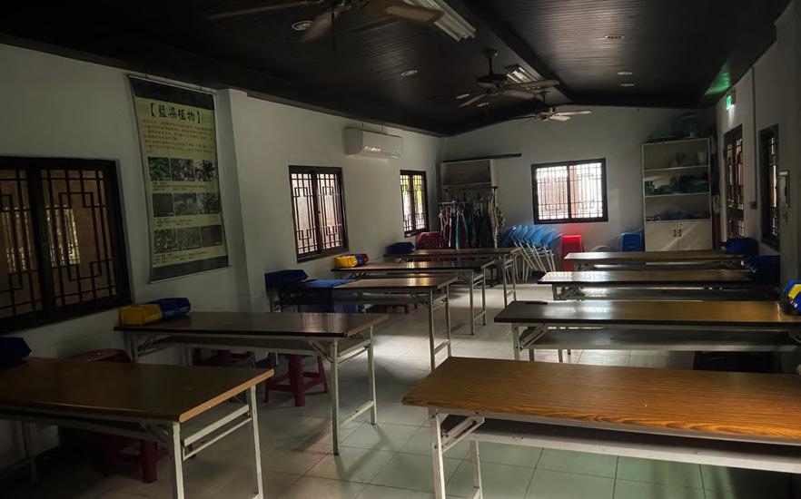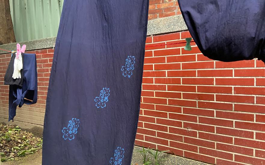 出老街的發展與商業化,反而造成在地藍染產業文化保存的逐漸式微與困窘現況。 述「三角湧文化協進會」作為非營利組織,卻依然致力於藍染工藝的文化修復及推廣的毅力和決心。 上圖為體驗課程結束後,空無一人的藍染體驗教室宛如 現今的產業現況,沒有年輕人接手傳承。 圖/吳秉勵攝 圖:即使面臨困境,協進會仍盡力製作一件件精美的作 品。 圖/吳秉勵攝 21