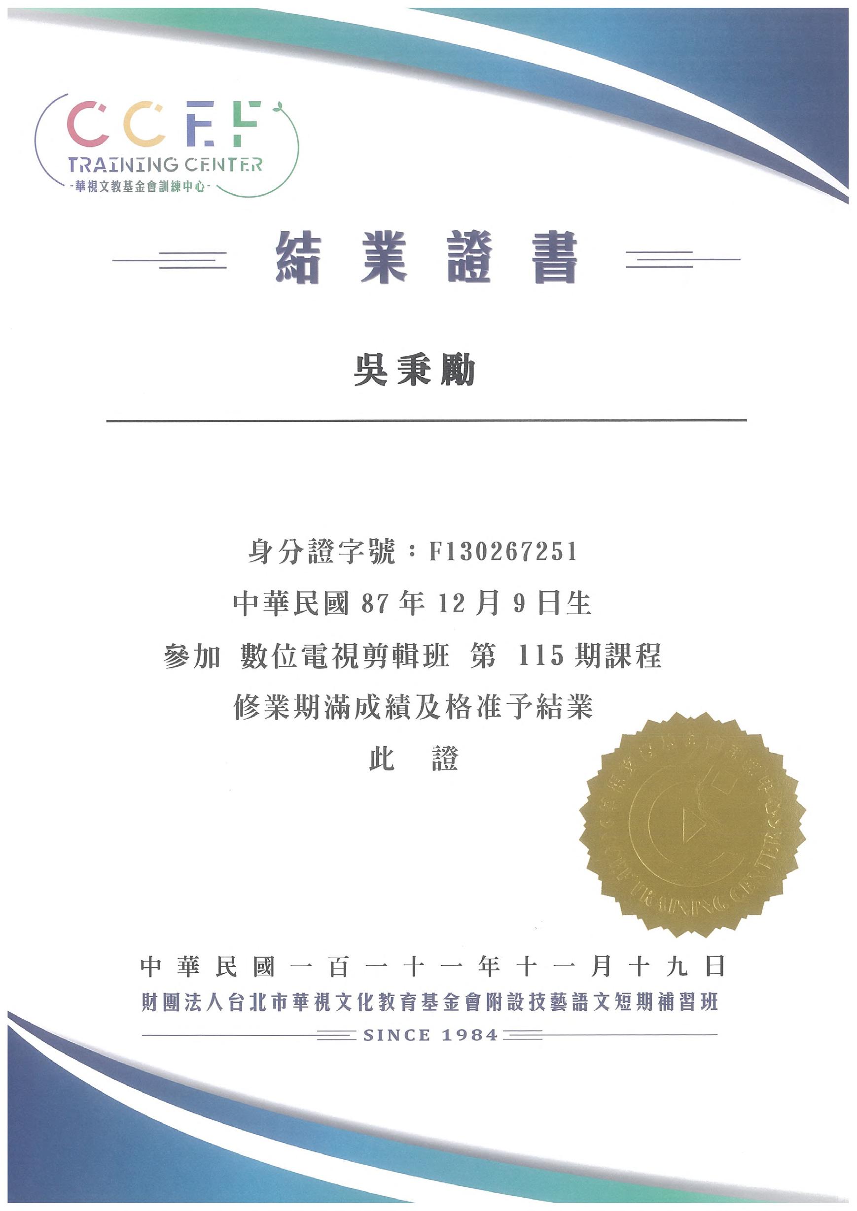 5 華視訓練中心 數位電視剪輯班 結業證書