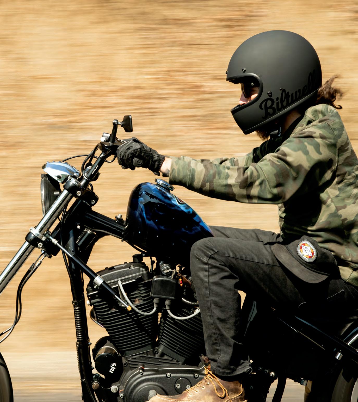 Flynn Bryant wringing his Sporty hardtail’s neck in a Flat Black Factory Gringo. According to our resident wizard chaser, the Gringo is the one helmet to have when you can only have one. Our classic full-face lid feels good, looks great, and fits the vibe of everything on two wheels.