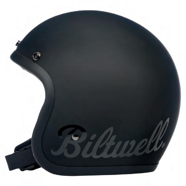 Bold Biltwell script wordmark gives this flat black lid its retro race feel.