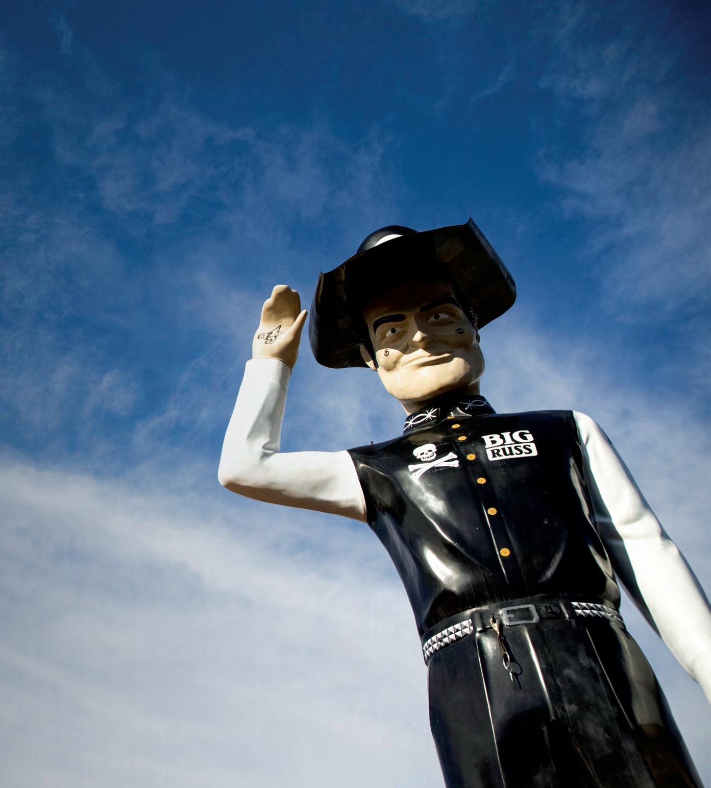 Butcher Ranch in Murrieta, CA, is Mark’s latest exercise in conceptual theater and elevates the cornpone world of cow shit and llama wool to high art. In a small footprint, Mark has packed his homestead with everything a serial entrepreneur with ADHD might dream of. Consider all this: well-stocked stables for pigs, goats, and alpacas; an elevated observation deck; a bull ring; a zipline; an underground bunker for his pet raccoon Bandit; and of course, a nicely appointed single-story home. Watching over the entire spread is a 30-foot-tall muffler shop mannequin named Big Russ, fully regaled in Rusty Butcher race livery. It’s the kind of place Willy Wonka might build for himself after going over the bars on a Hooligan Sportster once too often. In other words, just the way Mark likes it.