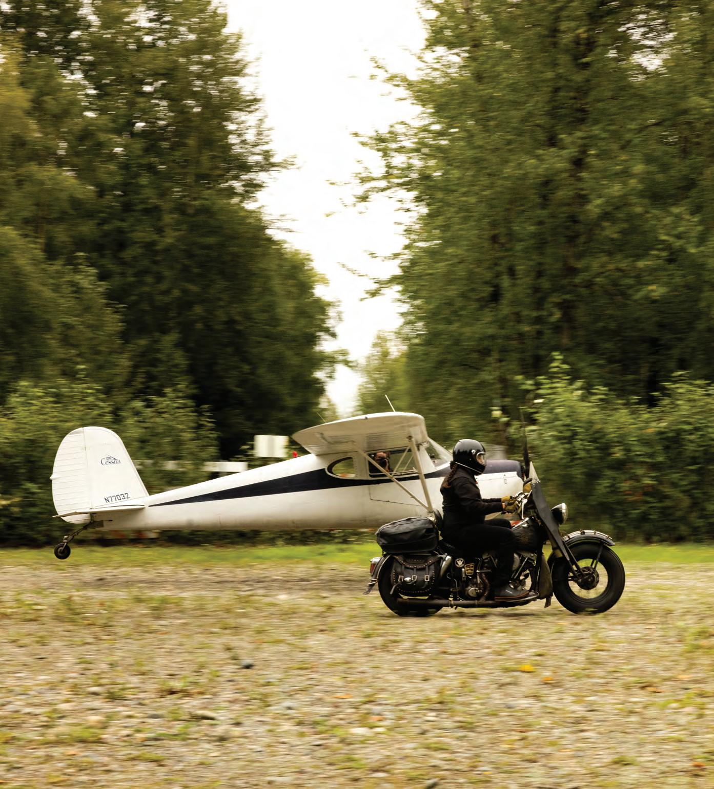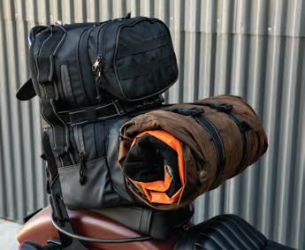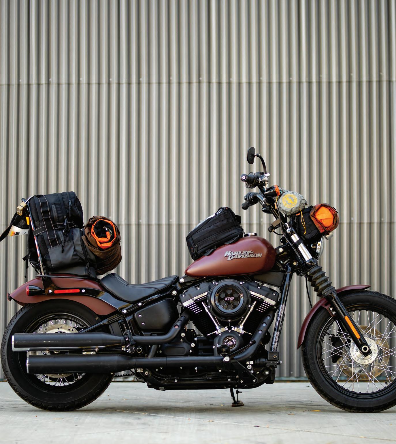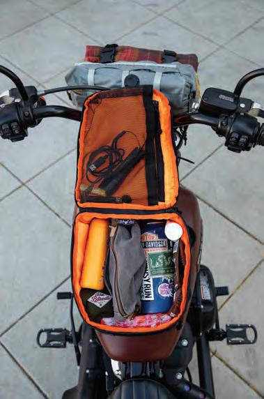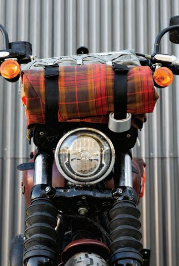 KEEP THE WEIGHT DOWN LOW Bill’s 1957 Harley junkwagon might not look like a good example of bike packing, but if you look close, the heavy bits are packed in saddle bags and lighter weight, easily accessible stuff is up higher in the milk crate on the fender rack. Keeping the center of gravity low on your motorcycle makes for safer and more predictable handling.