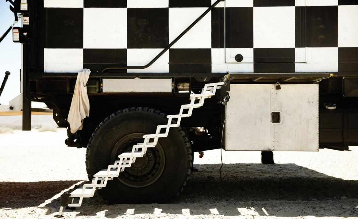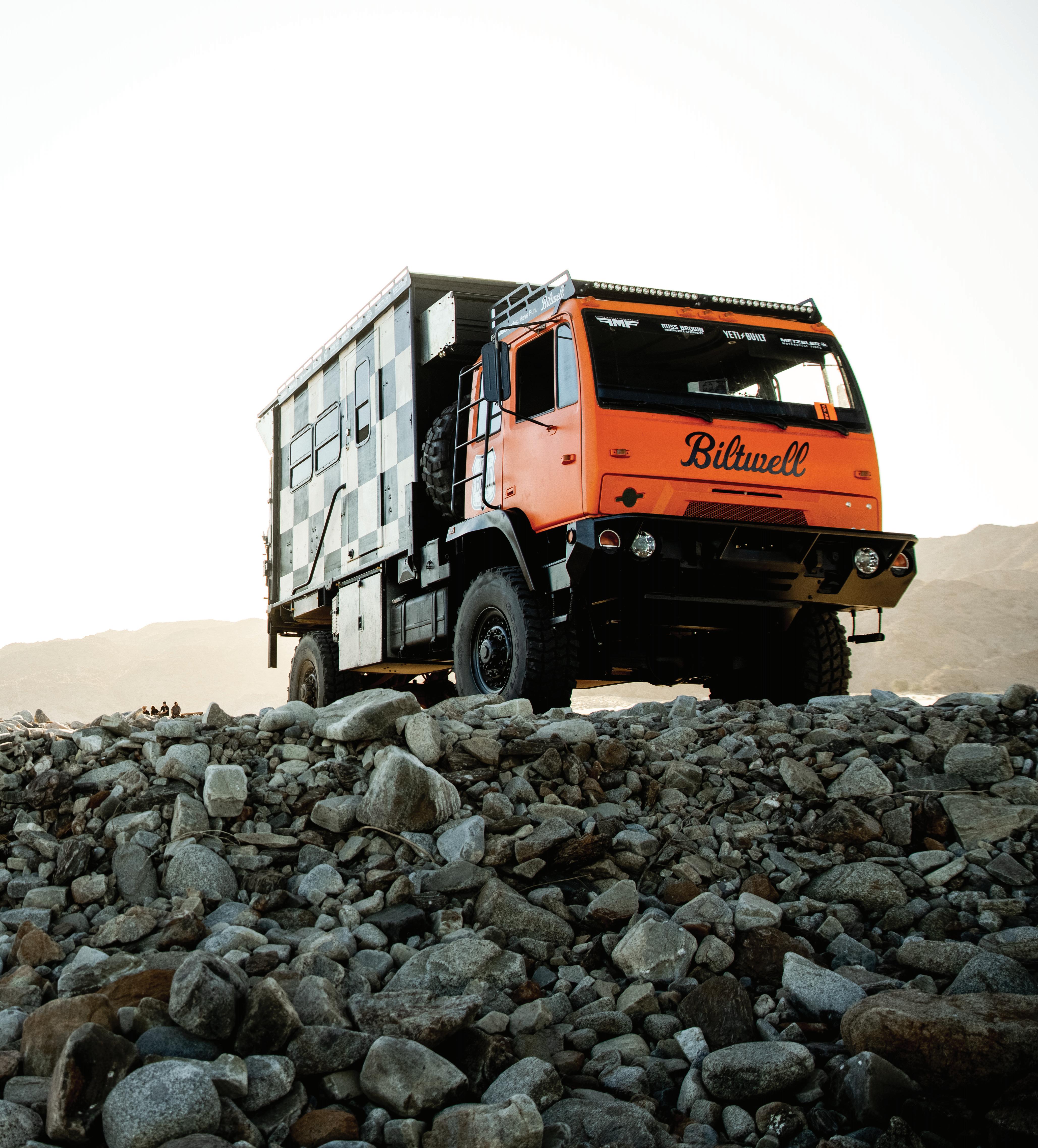When JD was done, the rig came back to the Biltwell tree fort in Temecula just in time for Rouser to show up from Panama. Rob’s hit list included pulling miles of wire for lighting and charging, and finalizing dozens of electromechanical functions and upgrades. I built a little .30-cal ammo can into a locking fuse box/master switch/ USB station that’s linked to two 12-volt batteries to run all “house” functions. Those batteries are charged by the dual alternator that also sends juice to the bank of 24-volt batteries that start the diesel engine. On one last slam before this year’s El Diablo Run, the team and I created awning supports, braced the mirrors, and stickered it all up with help from Biltwell ops manager BF Josh. With nothing left to do and everything to prove, we took our LMTV on its second official adventure: a 250-mile drive through the Mojave Desert for the Biltwell 100.