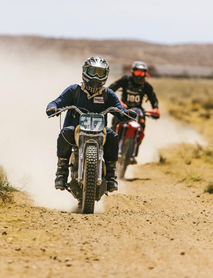1000 in 2018, there were 22 desert rats on Hogs at the 100: 15 novices and seven experts. The remaining classes were similarly tailored to the needs of dirt bike owners in the real world. Vintage MX and enduro bikes, late-model monoshocks, crusty desert-spec customs from Japan and Europe—you name it. If it had two wheels, the Biltwell 100 had a class for it, even pull-start minibikes— there were two of those in the Misfit class that marked the back of the grid.