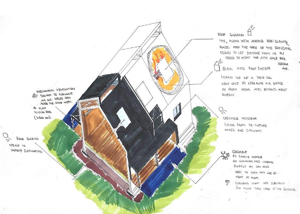 Two existing projects, all within different climate zones, are modified to a temperate oceanic climate such as Manchester. Solutions such as zinc roof capping, replacement of glass window systems to double glazing and increasing insulation layers to meet Passivhaus standards of 300 mm are just some of the things illustrated above.