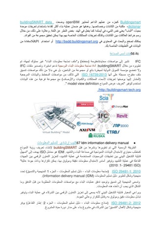 Buildingsmartﻛﺟﺯء ﻣﻥ ﻋﻣﻠﻬﻡ ﺍﻟﺩﺍﻋﻡ ﻟﻣﻌﺎﻳﻳﺭ openBIMﻭﺿﻌﺕ buildingSMART data ،dictionarﻣﻛﺗﺑﺔ ﻣﻥ ﺍﻟﻛﺎﺋﻧﺎﺕ ﻭﺧﺻﺎﺋﺻﻬﺎ .ﻭﻫﺩﻓﻬﺎ ﻫﻭ ﺿﻣﺎﻥ ﻋﻣﻠﻳﺔ ﺑﻧﺎء ﺃﻛﺛﺭ ﻛﻔﺎءﺓ ﺑﺎﺳﺗﺧﺩﺍﻡ ﺗﻌﺭﻳﻔﺎﺕ ﻣﻭﺣﺩﺓ ﺑﺣﻳﺙ" ،ﺍﻟﺑﺎﺏ" ﻳﻌﻧﻲ ﻧﻔﺱ ﺍﻟﺷﻲء ﻓﻲ ﺃﻳﺳﻠﻧﺩﺍ ﻛﻣﺎ ﻳﻔﻌﻝ ﻓﻲ ﺍﻟﻬﻧﺩ ﺑﻐﺽ ﺍﻟﻧﻅﺭ ﻋﻥ ﺍﻟﻠﻐﺔ .ﻭﻋﻼﻭﺓ ﻋﻠﻰ ﺫﻟﻙ ،ﻣﻥ ﺧﻼﻝ ﺭﺳﻡ ﺧﺭﺍﺋﻁ ﺍﻟﻌﻼﻗﺎﺕ ﺑﻳﻥ ﺍﻟﻛﺎﺋﻧﺎﺕ ﻭﻛﺫﻟﻙ ﺗﻌﺭﻳﻔﺎﺕ ﺍﻟﻣﻣﺗﻠﻛﺎﺕ ﺍﻟﺧﺎﺻﺔ ﺑﻬﻡ ﺑﻬﺫﺍ ﻳﻣﻛﻥ ﺗﺣﻘﻳﻖ ﻣﺟﻣﻭﻋﺔ ﻣﻥ ﺍﻟﻔﻭﺍﺋﺩ. ﻳﻣﻛﻧﻙ ﺗﺻﻔﺢ ﻭﺍﻟﺑﺣﺙ ﻓﻲ ﺍﻟﻣﺣﺗﻭﻯ ﻓﻲ http://bsdd.buildingsmart.orgﺃﻭ ﺍﺳﺗﺧﺩﺍﻡ APIﻟﻼﺳﺗﻔﺎﺩﺓ ﻣﻥ ﺍﻟﺑﻳﺎﻧﺎﺕ ﻓﻲ ﺍﻟﺗﻁﺑﻳﻘﺎﺕ ﺍﻟﺧﺎﺻﺔ ﺑﻙ. 56 ifcﻓﺋﺎﺕ ﺃﺳﺱ ﺍﻟﺻﻧﺎﻋﺔ ﺗﺷﻳﺭ ﺇﻟﻰ ﻣﻭﺍﺻﻔﺎﺕ ﻣﺣﺎﻳﺩﺓ\ﻣﻔﺗﻭﺣﺔ )ﻣﺧﻁﻁ( ﻭ"ﻣﻠﻑ ﻧﻣﺫﺟﺔ ﻣﻌﻠﻭﻣﺎﺕ ﺍﻟﺑﻧﺎء" ﻏﻳﺭ ﻣﻣﻠﻭﻙ ﻟﺟﻬﺔ ،ﺗﻡ IFC ﺗﻁﻭﻳﺭﻩ ﻣﻥ ﺧﻼﻝ .buildingSMARTﺃﺩﺍﺓ ﻧﻣﺫﺟﺔ ﻣﻌﻠﻭﻣﺎﺕ ﺍﻟﺑﻧﺎء ﺍﻟﺑﺭﻣﺟﻳﺔ ﺗﺩﻋﻡ ﺍﺳﺗﻳﺭﺍﺩ ﻭﺗﺻﺩﻳﺭ ﻣﻠﻔﺎﺕ IFC ﻭﻻ ﺗﺧﺿﻊ ﻣﺅﺳﺳﺔ ﺍﻟﺗﻣﻭﻳﻝ ﺍﻟﺩﻭﻟﻳﺔ ﻟﺳﻳﻁﺭﺓ ﺑﺎﺋﻊ ﺃﻭ ﻣﺟﻣﻭﻋﺔ ﻣﻥ ﺍﻟﺑﺎﺋﻌﻳﻥ ،ﺑﻝ ﻫﻲ ﺑﺩﻻ ﻣﻥ ﺫﻟﻙ ﻣﻭﺍﺻﻔﺎﺕ ﺗﻧﺳﻳﻖ ﻣﻠﻑ ﻣﻔﺗﻭﺡ ،ﻣﺳﺟﻠﺔ ﻋﻠﻰ ﺃﻧﻬﺎ ISO 16739:2013ﺍﻟﺗﻲ ﺗﺗﺄﻟﻑ ﻣﻥ ﻣﻭﺍﺻﻔﺎﺕ ﺍﻟﻣﺧﻁﻁ ﻭﺍﻟﺑﻳﺎﻧﺎﺕ ﺍﻟﻣﺭﺟﻌﻳﺔ )ﺍﻟﻣﺷﺎﺭ ﺇﻟﻳﻬﺎ ﺑﻭﺻﻔﻬﺎ ﺗﻌﺭﻳﻔﺎﺕ ﻷﺳﻣﺎء ﺍﻟﻣﻣﺗﻠﻛﺎﺕ ﻭﺍﻟﻛﻣﻳﺎﺕ ﻭﺍﻷﻭﺻﺎﻑ( ﻣﻊ ﻣﺟﻣﻭﻋﺔ ﻓﺭﻋﻳﺔ ﻣﻥ ﻫﺫﻩ ﺍﻟﺑﻳﺎﻧﺎﺕ ﺗﺳﺗﺧﺩﻡ ﻟﺗﻭﻓﻳﺭ "ﺗﻌﺭﻳﻑ ﻋﺭﺽ ﺍﻟﻧﻣﻭﺫﺝ ." model view definition /http://buildingsmart-tech.org
