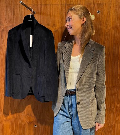 BLAZER I FLØJL. MARINE FRA LARDINI OG GRØN FRA TAGLIATORE.