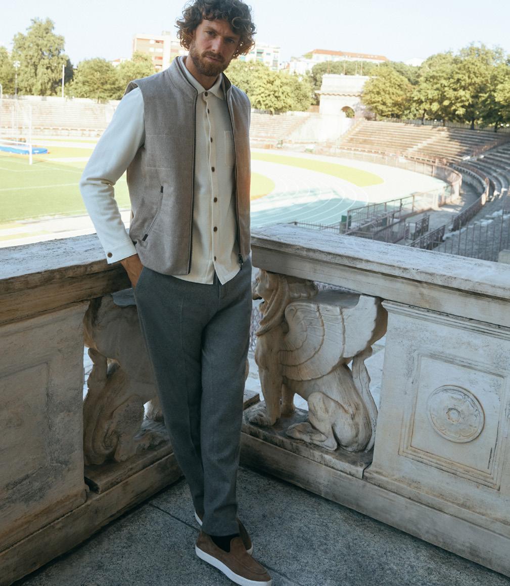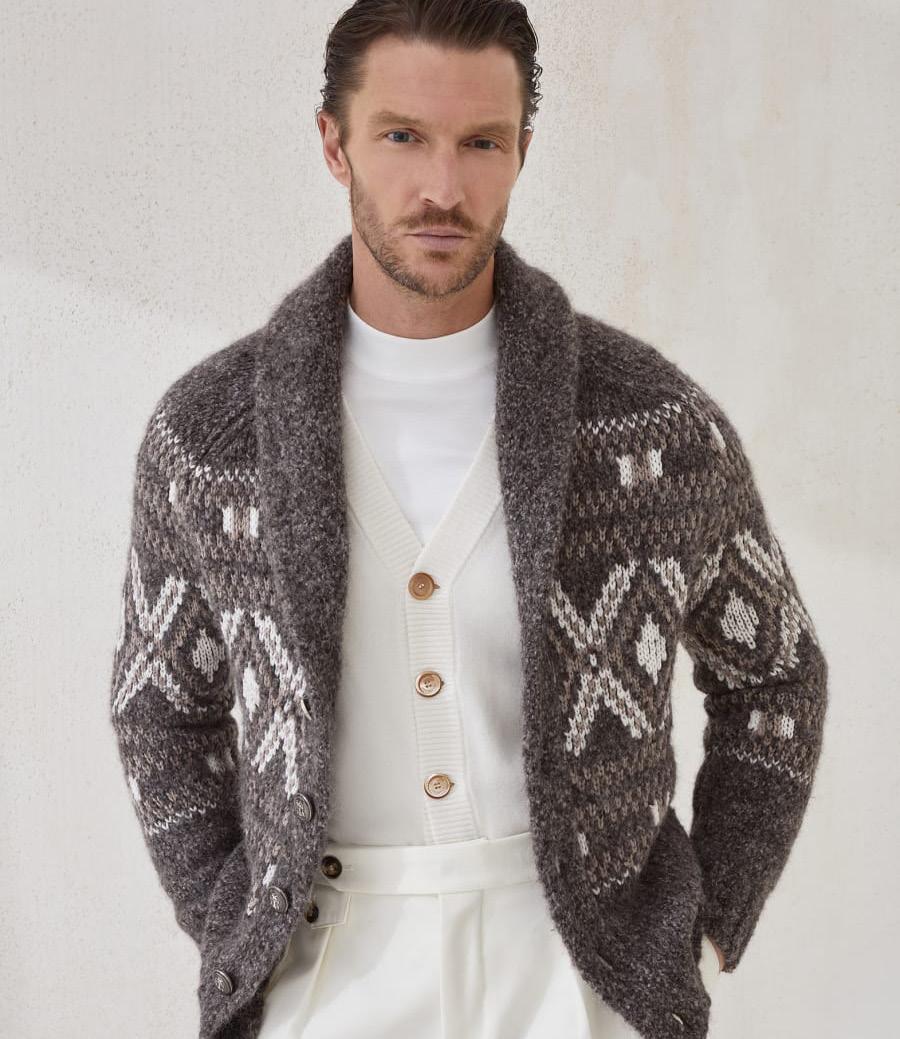 MICHAEL I LARDINI BLAZER, BRUNELLO CUCINELLI CARDIGAN OG SANTONI LOAFERS.
