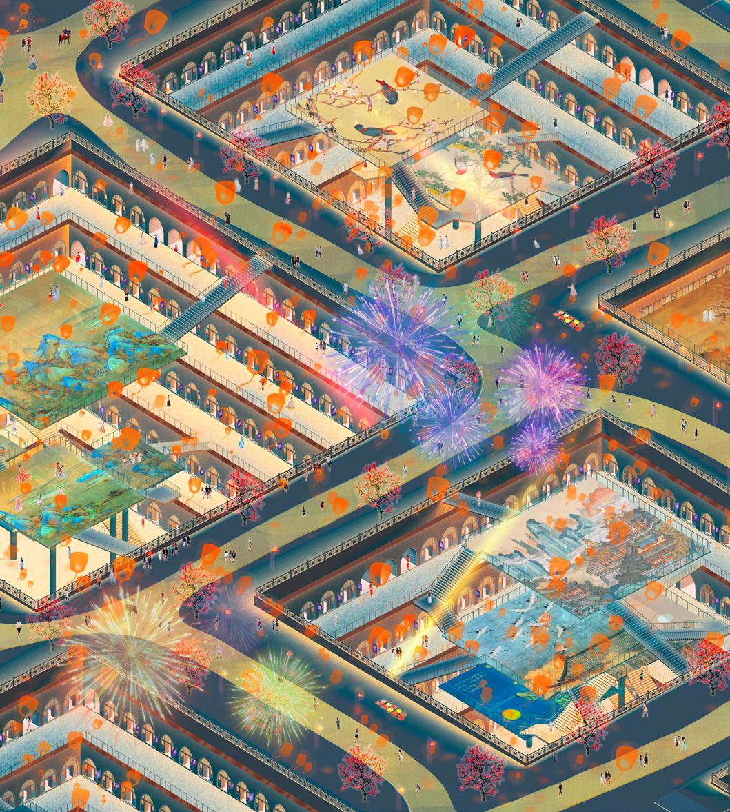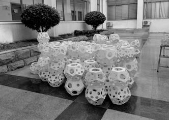 Our design hides the Chinese philosophical elements of yin and yang coordination. Based on the Verferen structure, combined with minimal curved surfaces to generate and optimize the shape, and combined with human behavior to modify the internal space.TThe skin design is also derived from the texture of Taihu stone.After putting this installation on the public green space, we found that different groups of people interact with this installation differently and produce different behaviors.This is basically the same as the phenomenon that people have different behaviors in the space formed by Taihu Rock.