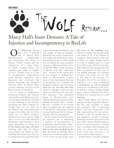 n Wednesday March 7th, 2012 a beloved RA in Marcy Hall (Mountainview Community) was terminated. The firing of Francis “Frank” Cinque was the culmination of a quiet chain of events starting before the academic year began in August of 2011. Frank’s story is a tale of incompetence, inappropriate work behavior, deception, and hypocrisy that surrounds the Reslife hierarchy, the Resident Director (RD) of Marcy Hall, and the Assistant Director of the Mountainview Community. It’s no secret to Binghamton University students that ResLife isn’t exactly a well-liked institution of our campus. Many view the RAs in their building as the Gestapo patrolling the halls looking for trouble. But not too often do we think of the ones pulling the strings of the RAs, who we often forget are our fellow students. Everyone has a boss, and in a RAs case, it is his or her RD. ResLife’s Residential Hall Directors often pride themselves on being part of the family that they call their building staff. RAs are chosen and trained to be leaders in their building and community. They are to always maintain a professionally 18