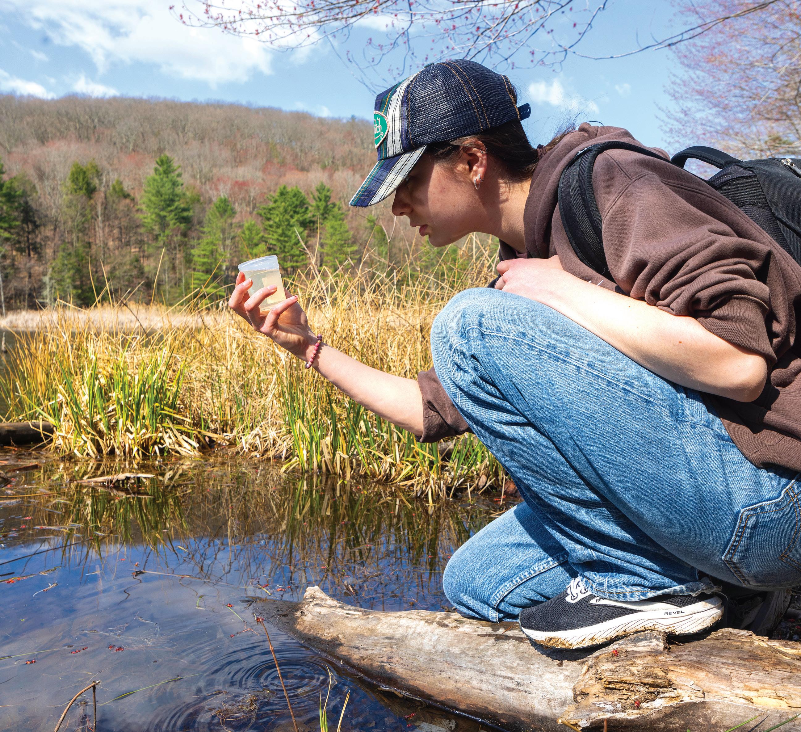 Donors provide essential support to enhance the First-year Research Immersion Program. In this FRI class in April 2025, a student collects water samples in the Nature Preserve to test for DNA from a wildlife disease.
