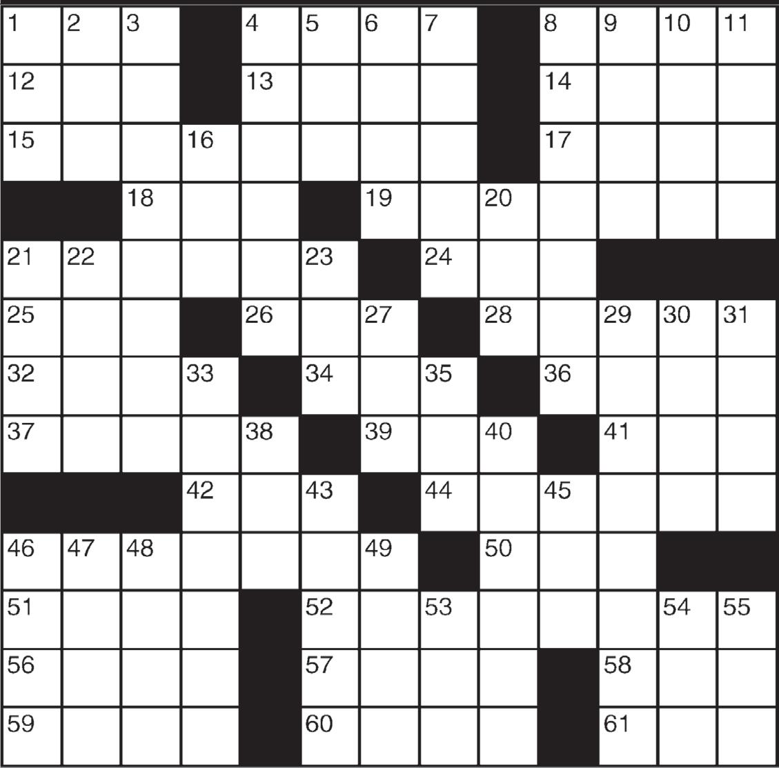 ACROSS 1 Restroom, for short 4 Back talk 8 Blunders 12 Yale student 13 Friends, old style 14 Manner of walking 15 Gut level 17 Sans siblings 18 Feline 19 Snake or lizard 21 Untamed horse 24 Apiece 25 Second person 26 Wheel center 28 Basic assumption 32 Piquancy 34 Afternoon beverage 36 Water conduit 37 Come in 39 Sprite 41 Stitch 42 Tin Man’s need 44 Altrock band, Barenaked -46 Cheesy paper 50 Make marginalia 51 Vivacity, musically 52 Hun opponent 56 Enthusiastic 57 Send forth 58 Fish eggs 59 Optimistic 60 Antitoxins 61 Agent DOWN 1 Third O.T. bk. 2 Boxer Muhammad 3 Baron’s superior 4 Draw 5 Melody 6 Celebrity 7 Drag (Var.) 8 Braggart’s journey? 9 Hindu princess 10 Streamlet 11 Eyelid woe 16 Has the skill set 20 Coatrack part 21 Memory measure 22 Reddish horse 23 No longer stylish 27 Spelldown 29 Guests 30 Duel tool 31 Nightly telecast 33 Earth science 35 Every last