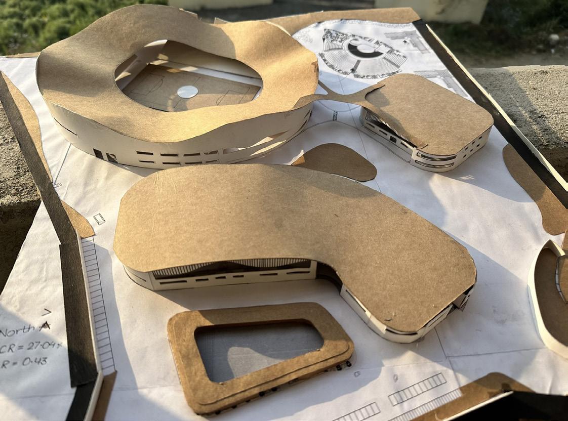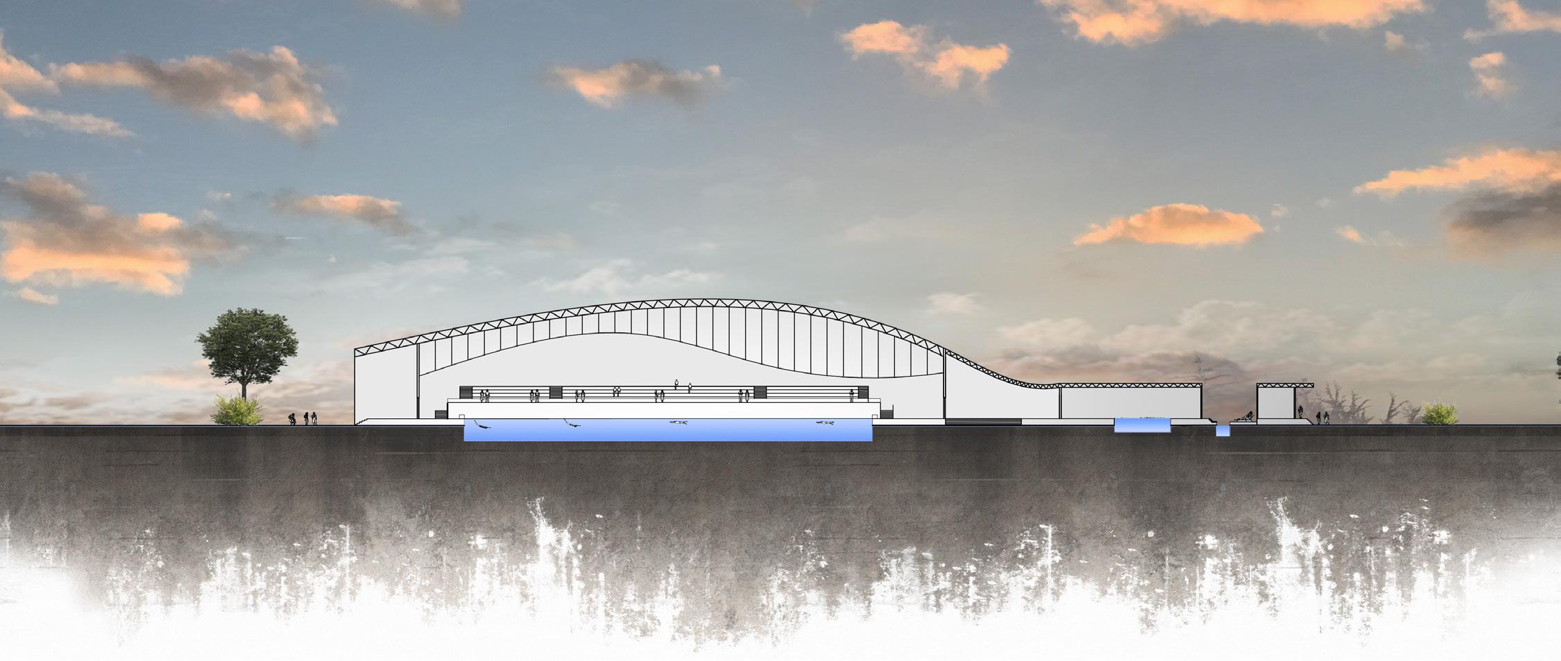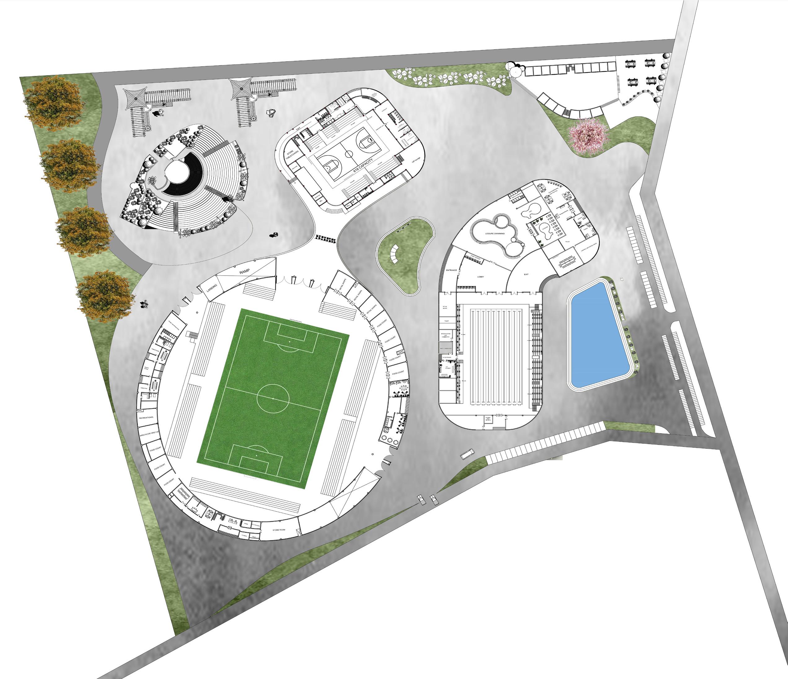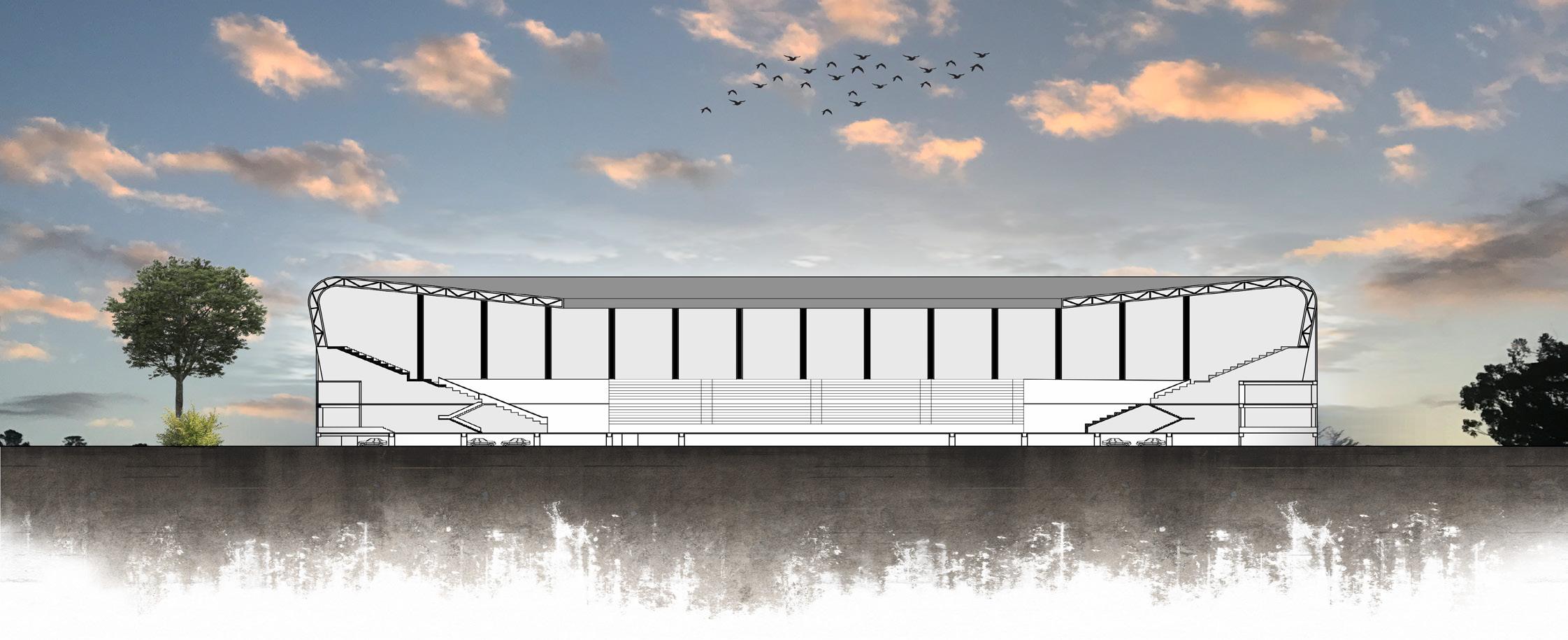 For form development, I tried connecting roofs of stadium and multipurpose hall creating a covering for the plaza where people can rest and wait.