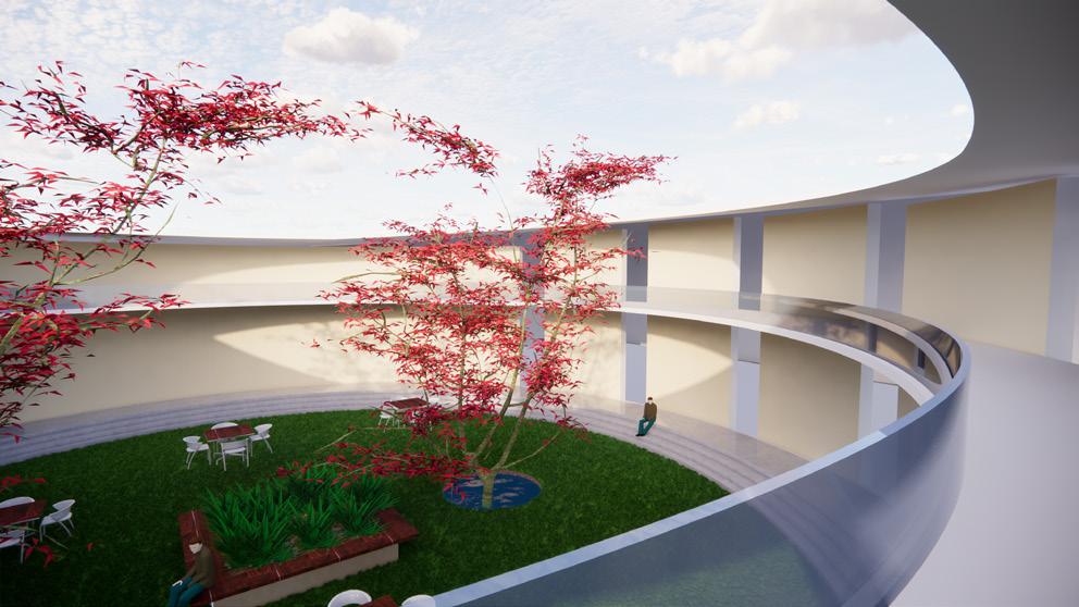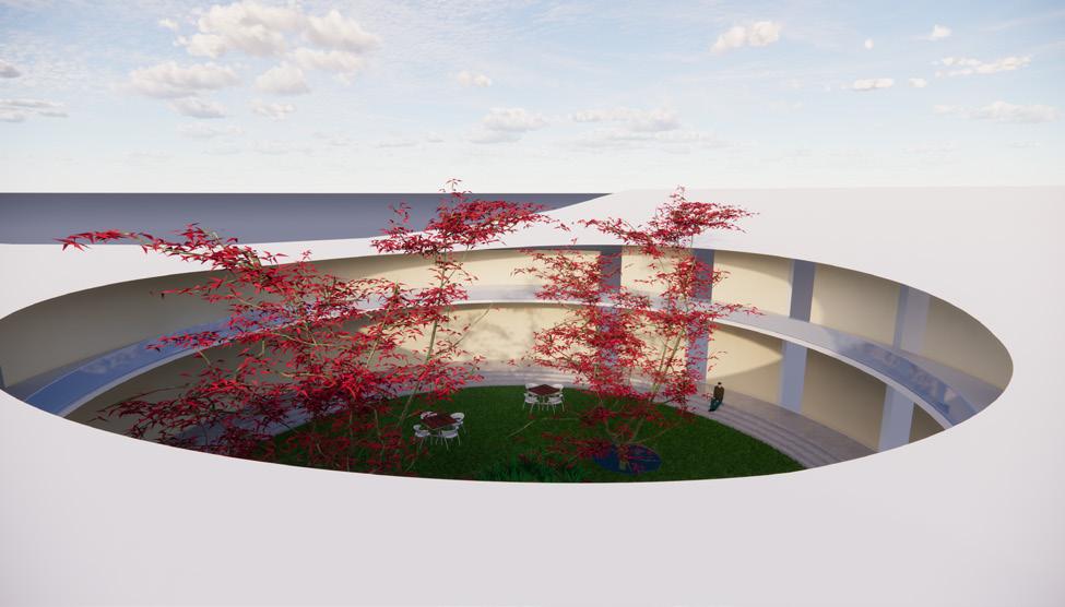The building material is mainly concrete to represent the shape, volume, and dynamics of the building clearly curve lines, of 12m radius, where visitors can walk and climb around. When visitors experience this pavilion, they feel at ease,that they feel conviviality. We introduced a circular interior glass space that is embraced by a concrete circular amphitheater and a green circular ramp like structure as a design element. The building as a whole represents a loop of memories and social interactions the pavilion is going to serve. Without a front or back, the building is free.
