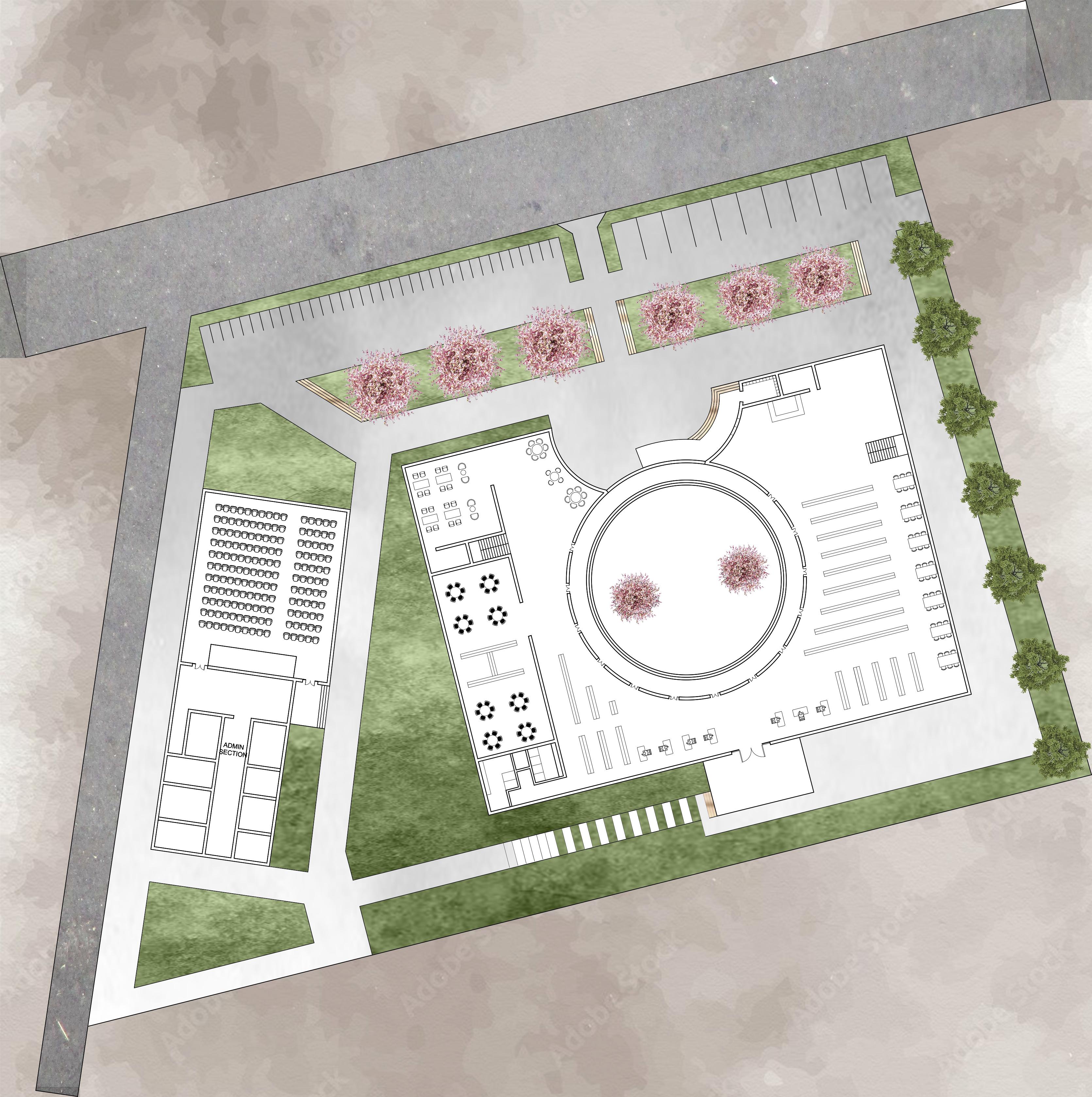 The design was for the community library where people of all age group can interact and facilitate themselves. So by contrasting rectangular and circular form, i tried to symbolizes the harmonious coexistence of opposing forces ,a tribute to duality and the balance.