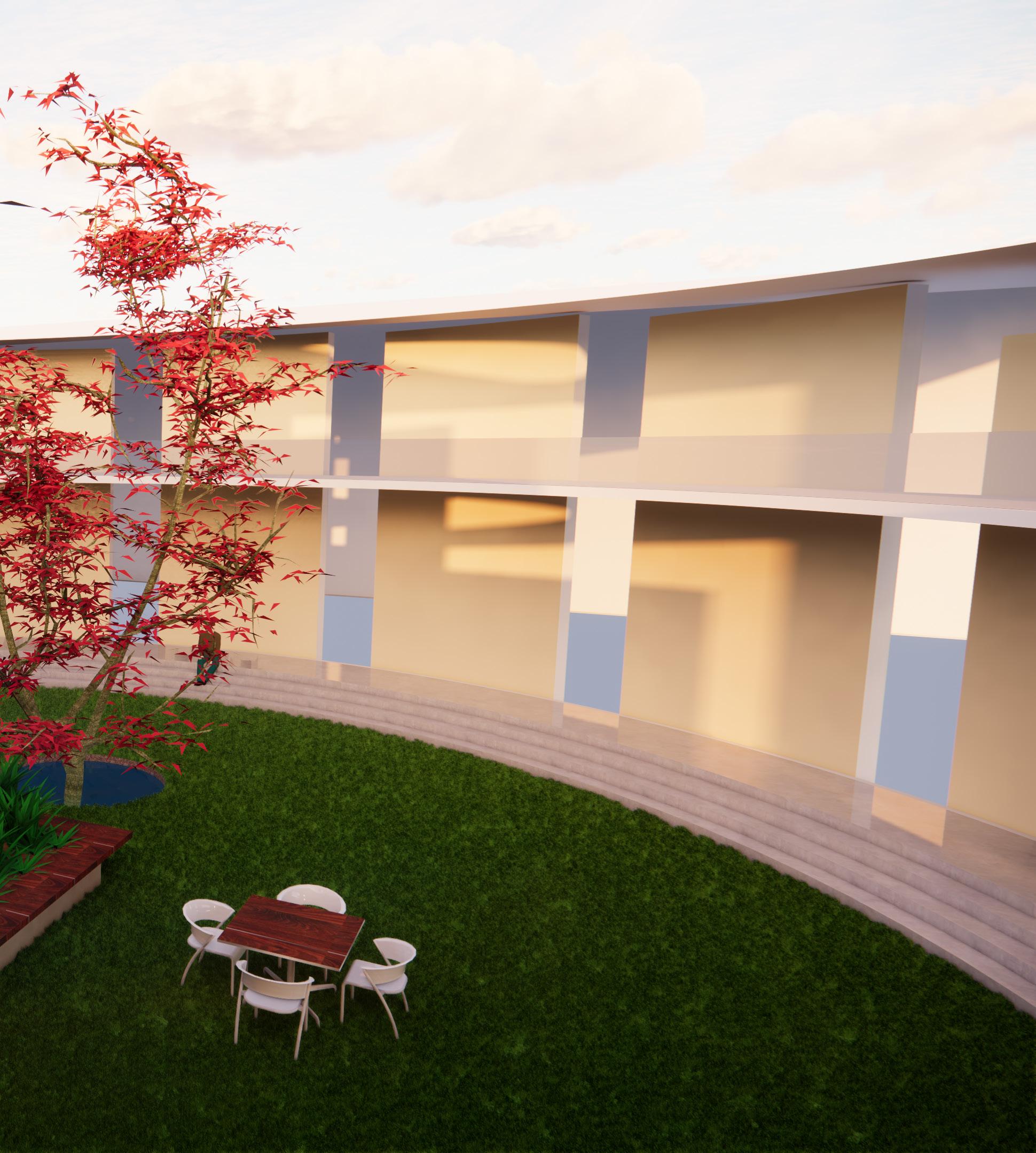 The circular courtyard in the middle was designed to be a flexible space,where people can sit and read .Also, it helps utilizing natural light,as the site is located in Bharatpur (abundant in daylight during summer season). Also it helps to make the landscape present and visible throughout the building.